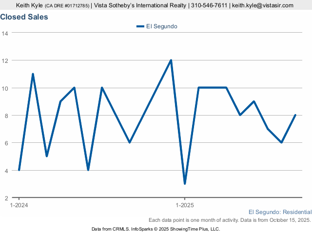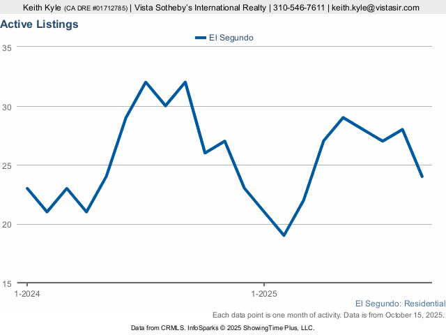 Recent market indicators are starting to show signs of a changing market in El Segundo. Notably the number of homes selling is on a sharp decline with the number of active listings is at a 12 month high. The chart below shows a month by month representation of the number of closed or recorded home sales. October saw only 8 homes that sold. By itself that wouldn’t mean much as the number of homes that sold can fluctuate greatly in El Segundo.
